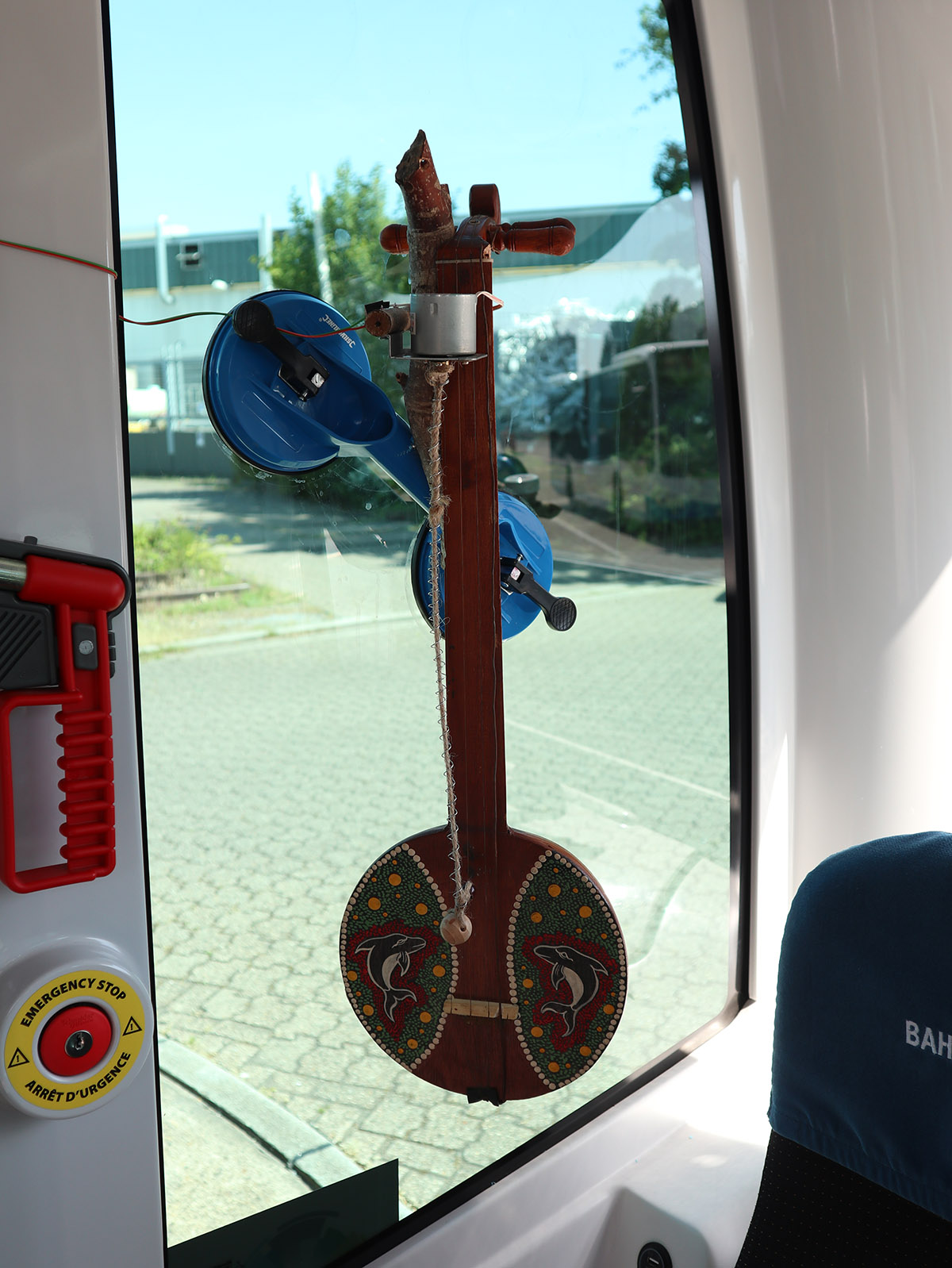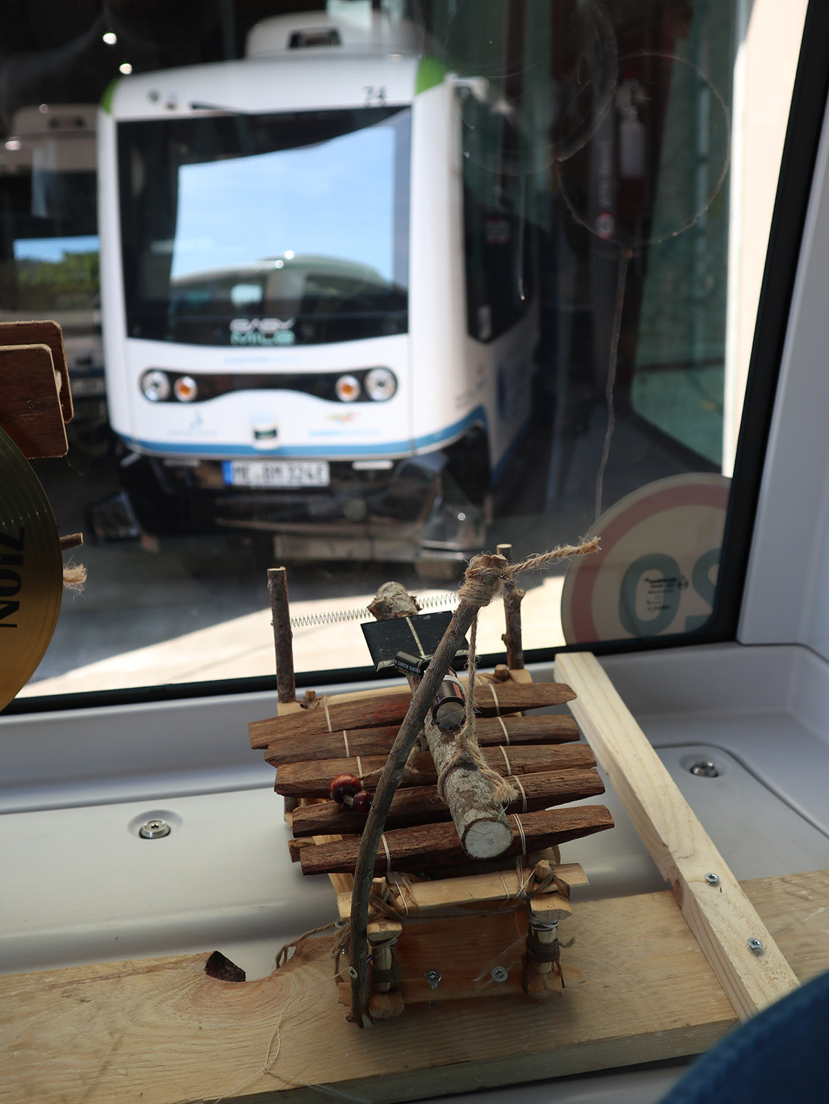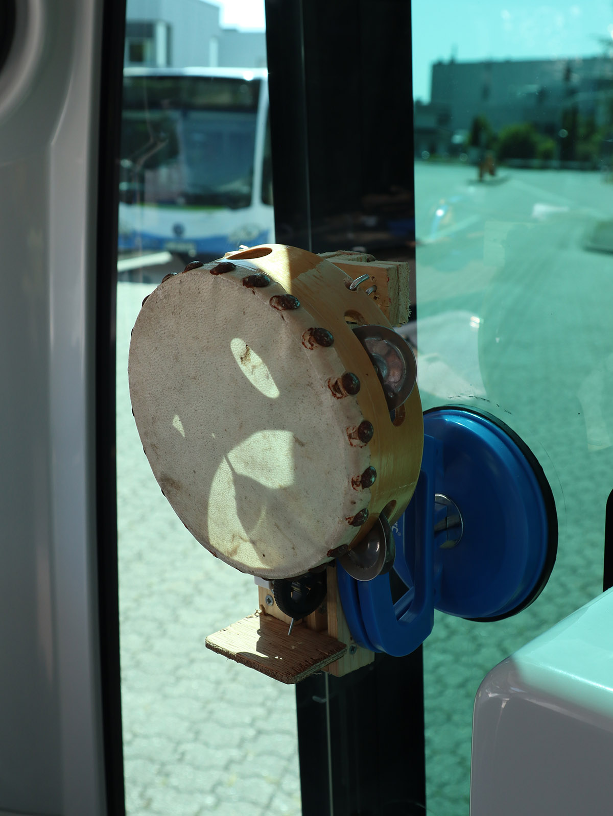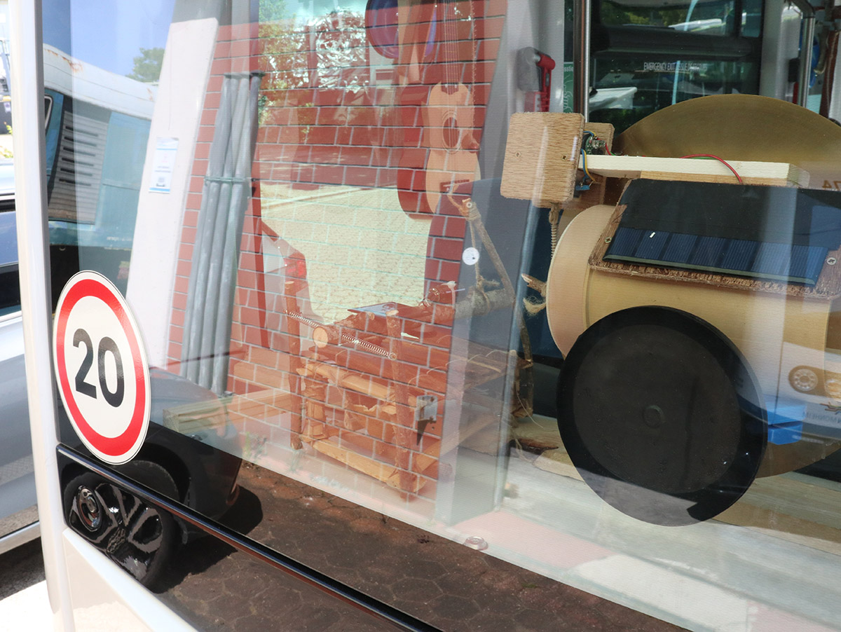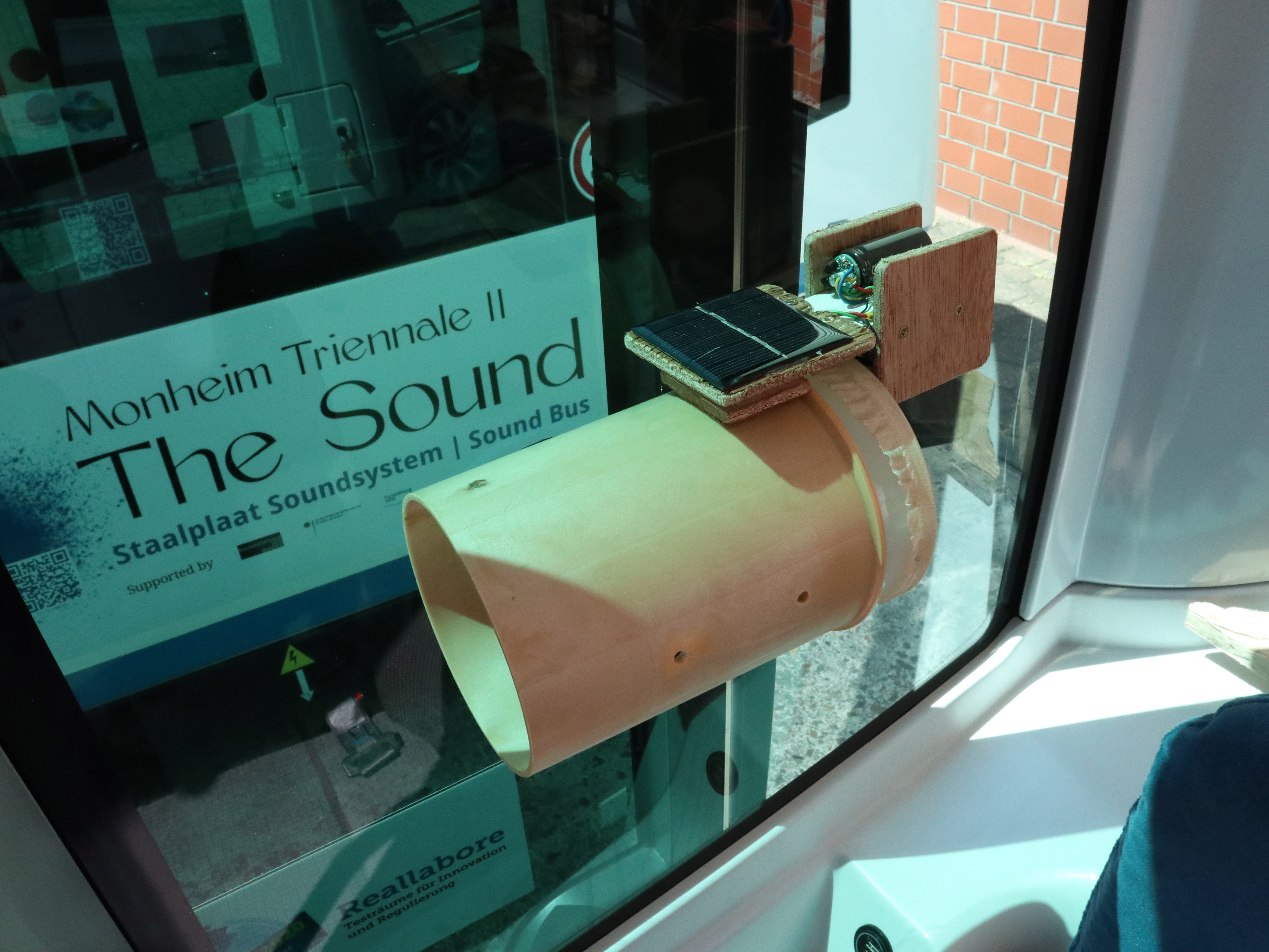 Geert-Jan was invited for the Monheim Trienale in 2023 to make a instalation with Staalplaat Sound System, when he found the self driving busses in Monheim a thought it would be nice if i also filled one of te busses with my solar instruments. Originaly the plan was to put a solar powered drum set on the bus but in the end it was not allowed on the bus, you can see a picture of it at the bottom of this page. So it ended up on the info desk, where it was also nice. I didnt make agood picture of it, maybe on another occation.