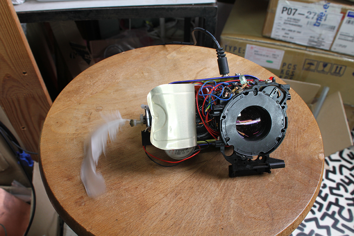 This is a fish made out of parts from a camera a tuna can and a feathre from the street.