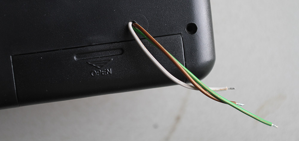 Drill the hole with a 3mm drill, and feed the wires thru.