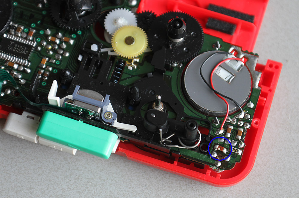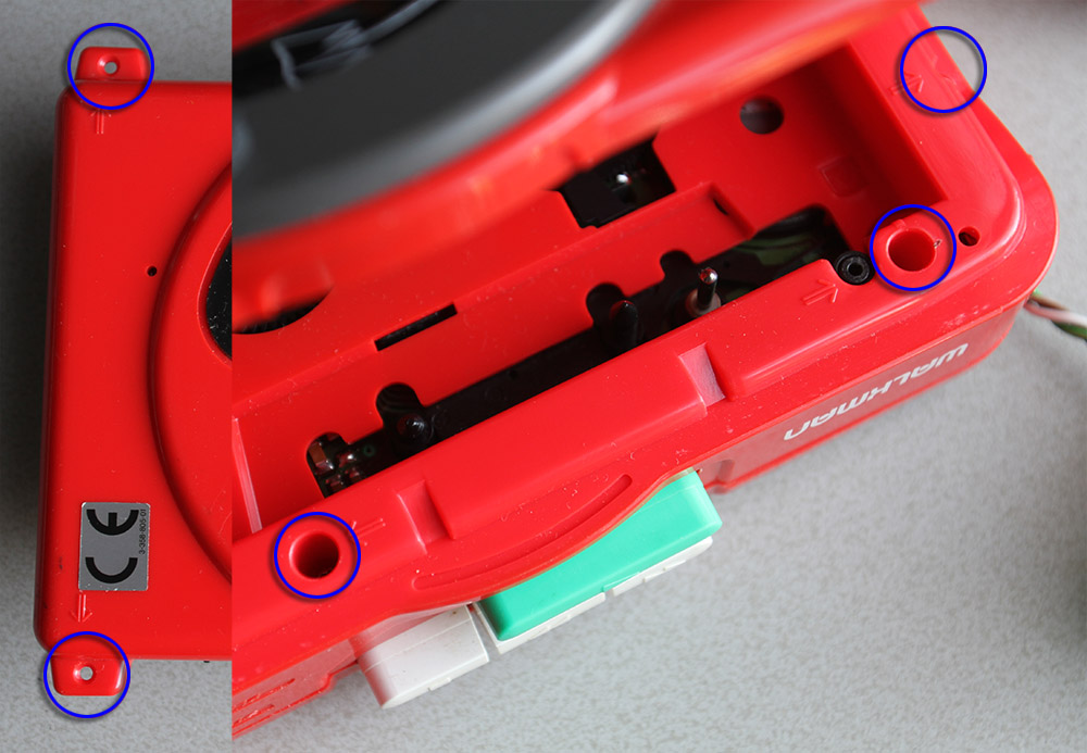 Open the walkman by removing the screws in the blue circles, keep them in a safe place.